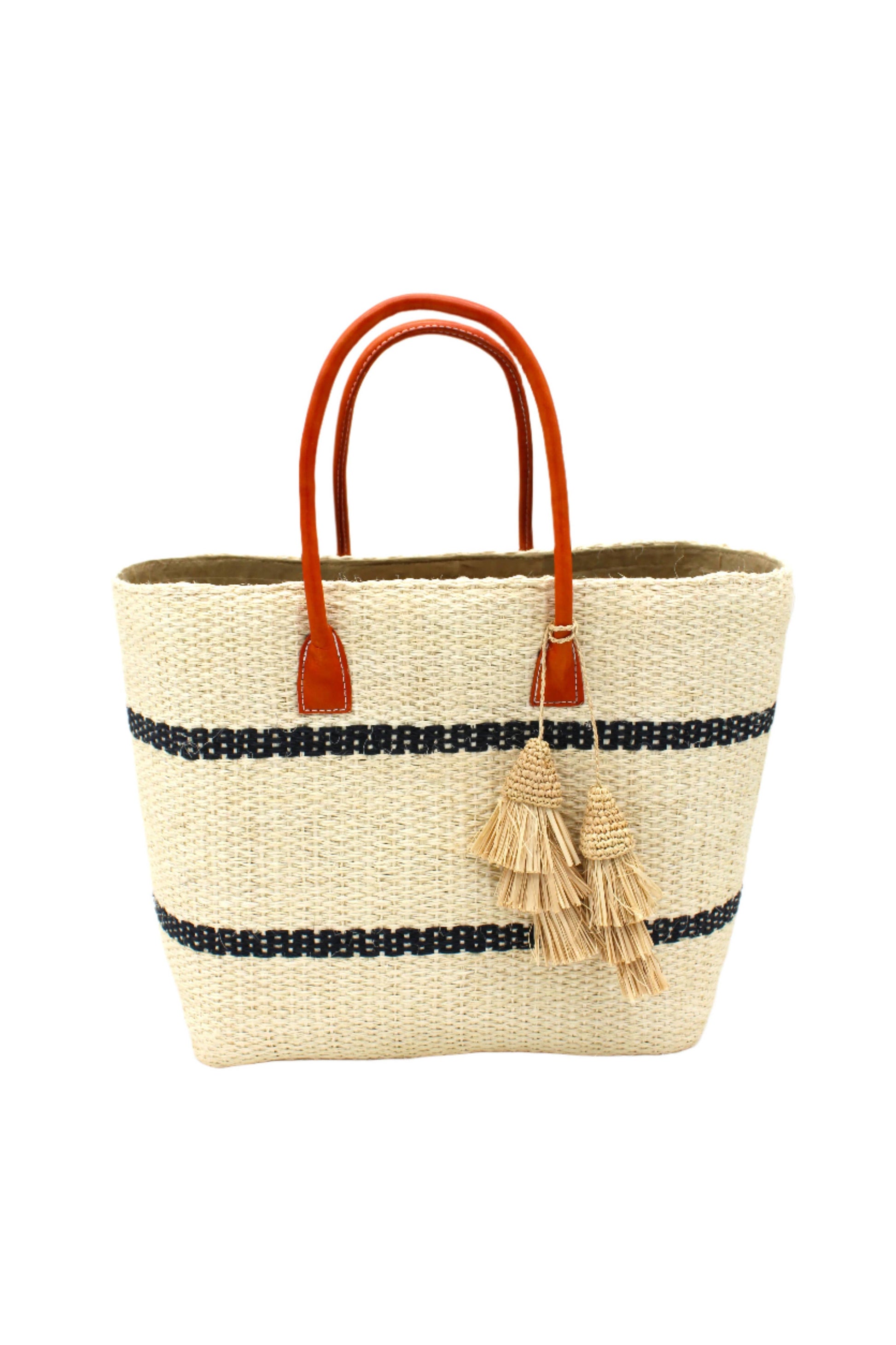 Crafted from hand-dyed all-natural sisal fibers, every bag is individually handmade and expertly woven into a distinctive horizontal stripe design. The convenient drawstring closure and built-in pocket offer practicality, while the charming raffia tassel adds a playful touch. Elevate your everyday look with a touch of tropical island style!