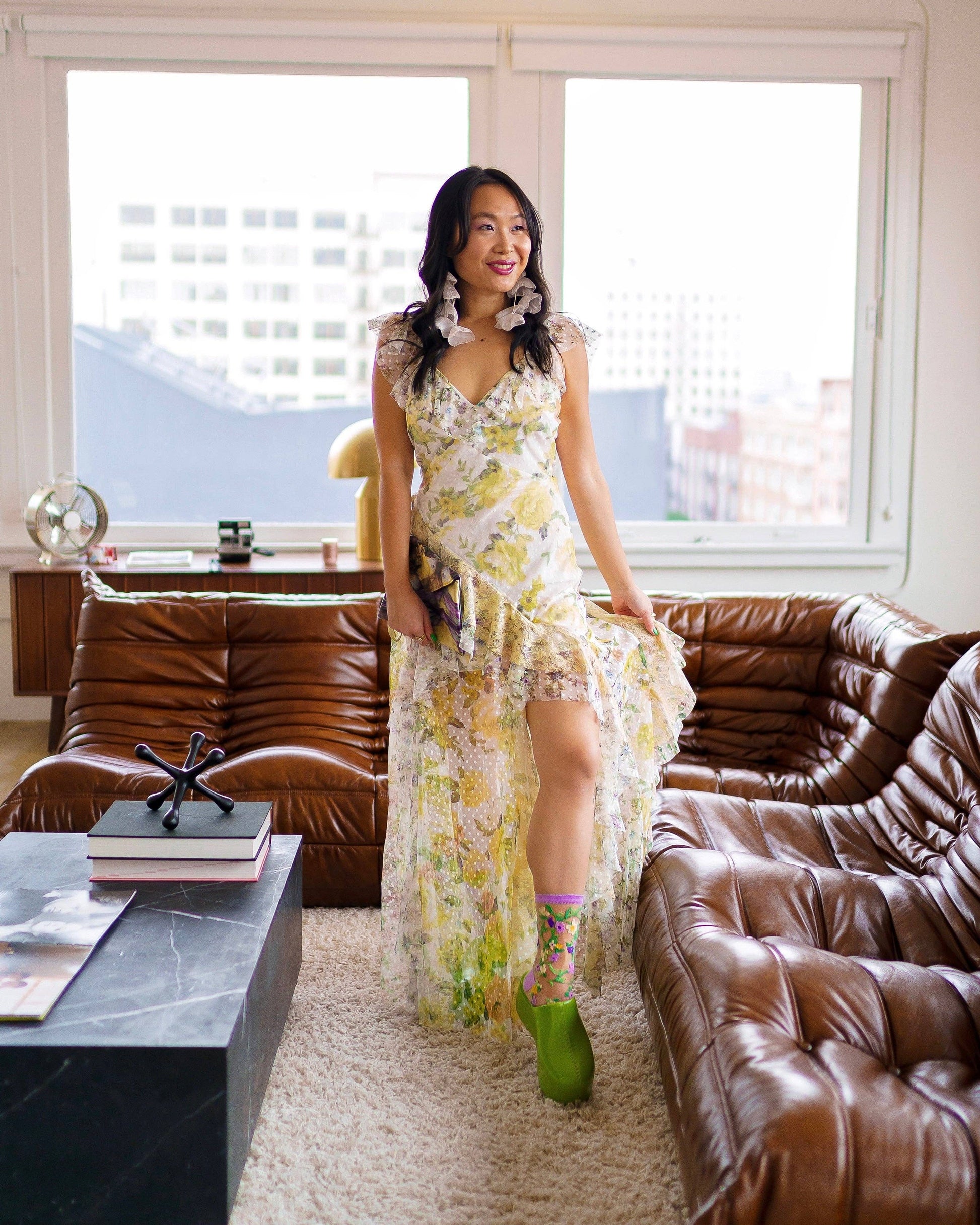 Inspired by our founder's wedding colors, delicate lavender and yellow florals are set on green vines to form two intertwined hearts at the ankle. Perfect for pairing with floral dresses and bridal looks, add a soft romantic touch with this sheer floral sock. Finished with a lavender cuff and ankle for an extra feminine vibe.