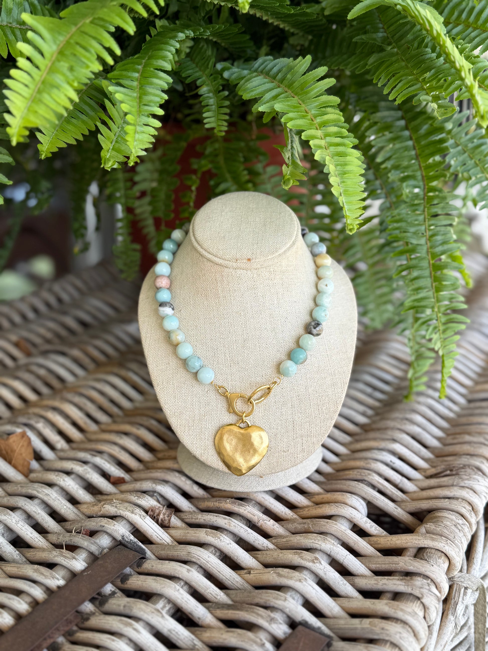 Heart Stone Necklace The Rachael necklace brings together two timeless elements lustrous pearls or amazonite and a chunky heart pendant for a look that's equal parts classic and contemporary.