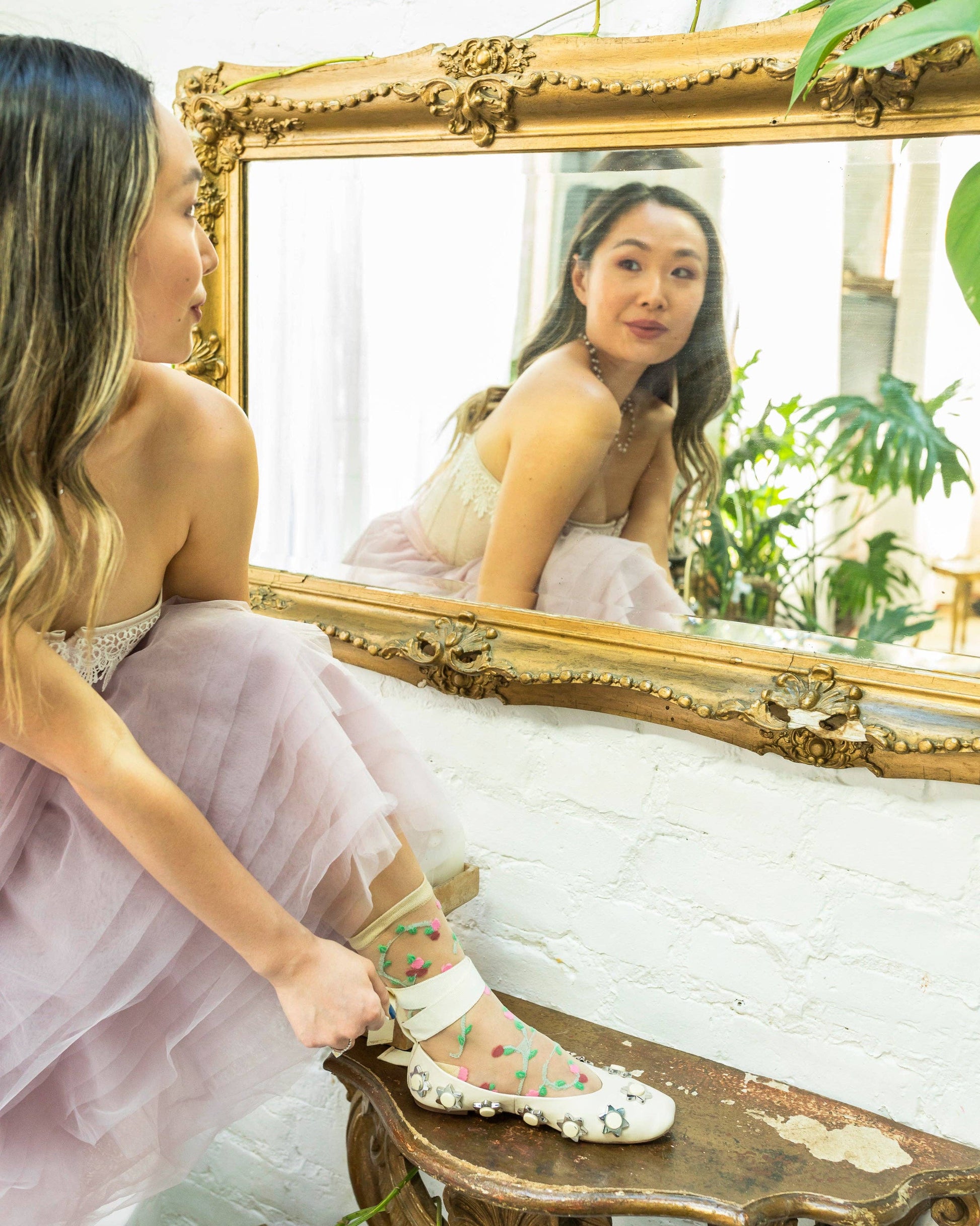 Inspired by Marie Antoinette, small pink rosettes grow on delicate green vines for an organically feminine feel. This pretty sheer floral sock sits slightly higher on the ankle and goes perfectly with midi skirts and peeking out from pants.